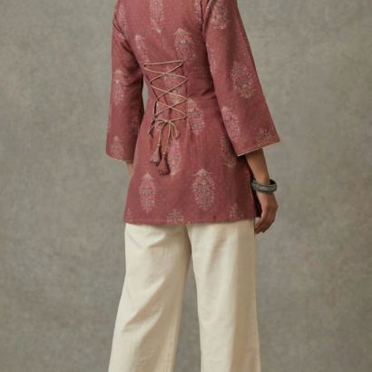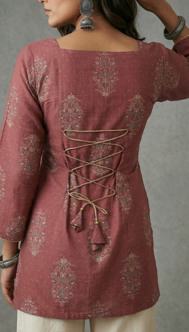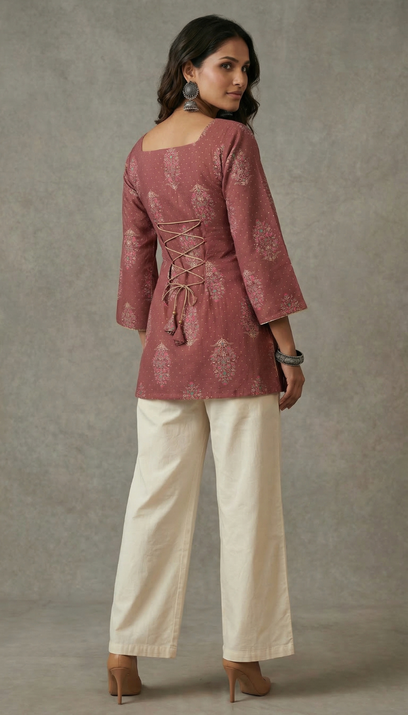Upgrade your wardrobe with this 100% pure cotton straight cut short top, designed for both comfort and style. Featuring a square neckline at the front and back, elegant full sleeves with slight flared cuffs, and delicate piping detailing, this top offers a refined look. The highlight is the corset-style lace-up back with tassel dori, allowing an adjustable and perfectly cinched fit for a flattering silhouette.