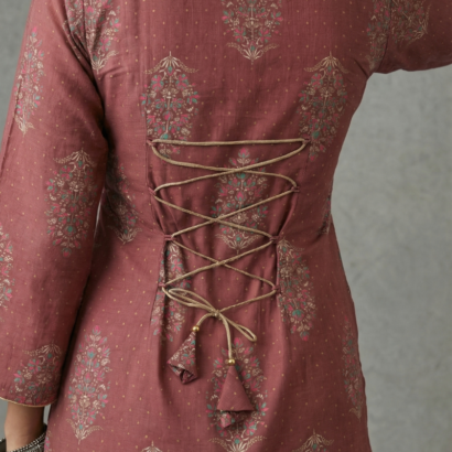 The standout feature is the corset-style lace-up back with cross dori and decorative tassels, allowing you to adjust the fit according to your comfort while creating a beautifully cinched waistline.