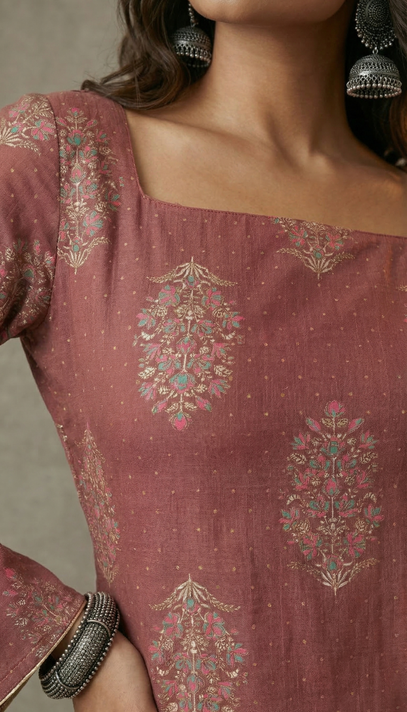 ✔ Elegant Full Sleeves – Full-length sleeves with slight bell/flared cuffs and piping detail.